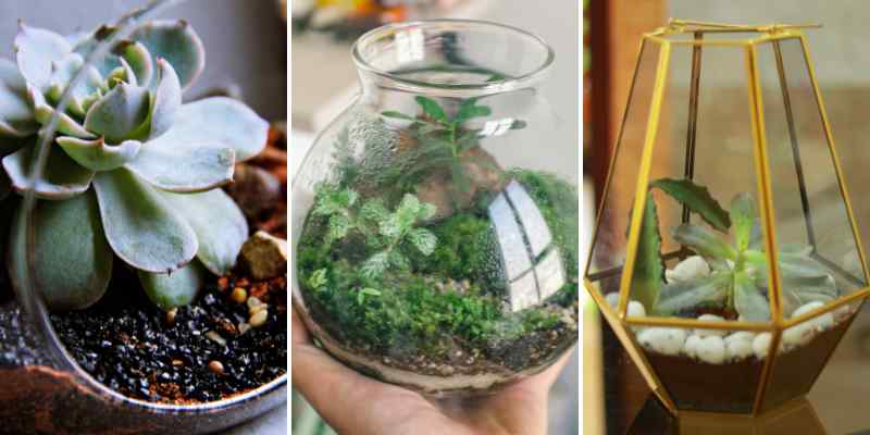 - Plantes : des plantes succulentes, des cactus pour un terrarium ouvert sec, ou des petites plantes vertes qui tolèrent un environnement sec (voir plus haut).