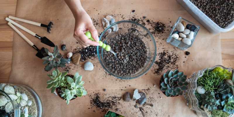 Déposez en premier le matériau drainant sur 4 à 5 cm au fond du contenant. Cela permettra de drainer l’excès d’eau et d’éviter que les racines ne pourrissent. Cela est indispensable à la fois pour le terrarium "sec" et le terrarium "humide".