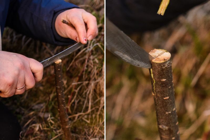 4- Prélevez ensuite une ou deux greffons sains, mesurant entre 5 et 10 centimètres, comportant des bourgeons. Taillez ensuite la base du greffon en biseau.