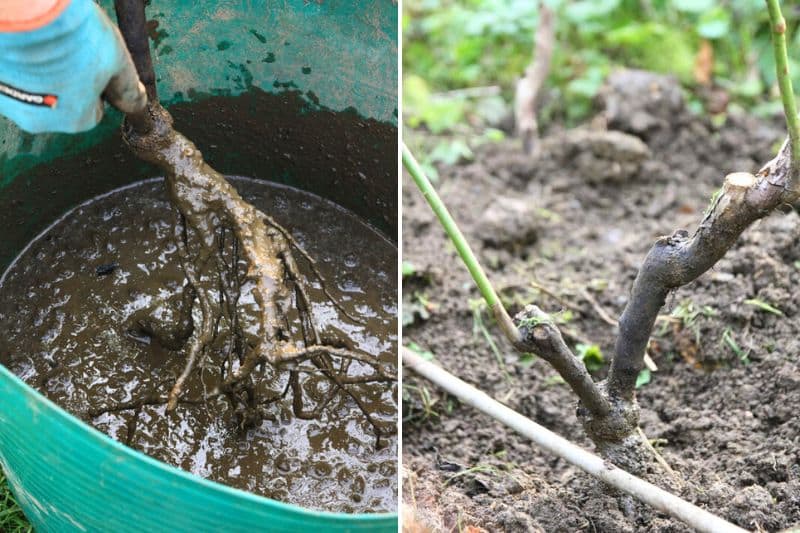 2- Si vous plantez un rosier en racines nues, préparez un pralin en mélangeant de la terre de jardin, du compost bien mûr et un peu d'eau pour obtenir une boue épaisse. Trempez les racines pendant une heure dans ce mélange pour les enrober. Cette bouillie protège les racines et augmente les chances de reprise.