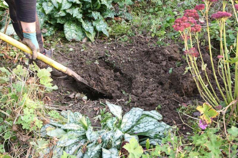 1- Creusez un trou assez grand (généralement de deux fois la taille de la motte) pour accueillir votre rosier et enrichissez la terre comme expliqué au chapitre précédent.