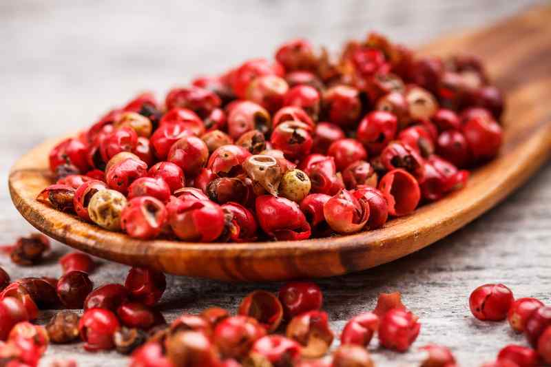 Parmi tous les poivres que l'on peut trouver dans le monde, le poivre rose est le seul qui usurpe un peu son nom, car il ne fait pas partie des Piper nigrum, dont sont issus les poivres que l'on connait bien, et ce ne sont pas botaniquement parlant des baies, mais des drupes. Également appelé faux poivre ou baie de bourbon, les baies roses sont issues de la fructification du Schinus molle et du Schinus terebinthifolius, les deux les plus communs, des arbres de la famille des Anacardiacées, dont font aussi partie le pistachier lentisque, le pistachier vrai et le manguier.