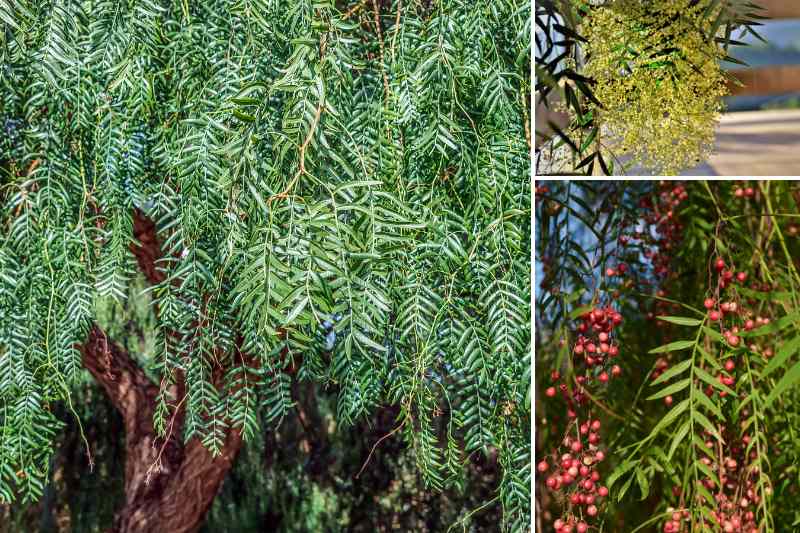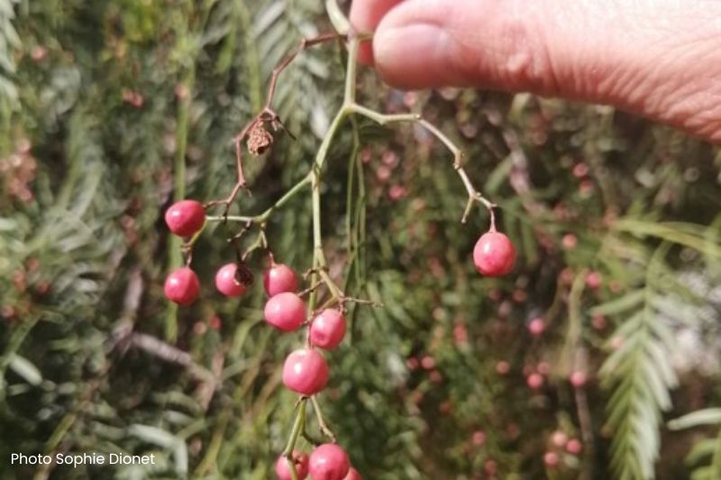 N.B. : moins courant chez nous que le Schinus molle, le Schinus terebinthifolius produit lui aussi les petites baies roses très aromatiques, mais elles peuvent irriter la peau lorsqu'on les manipule.