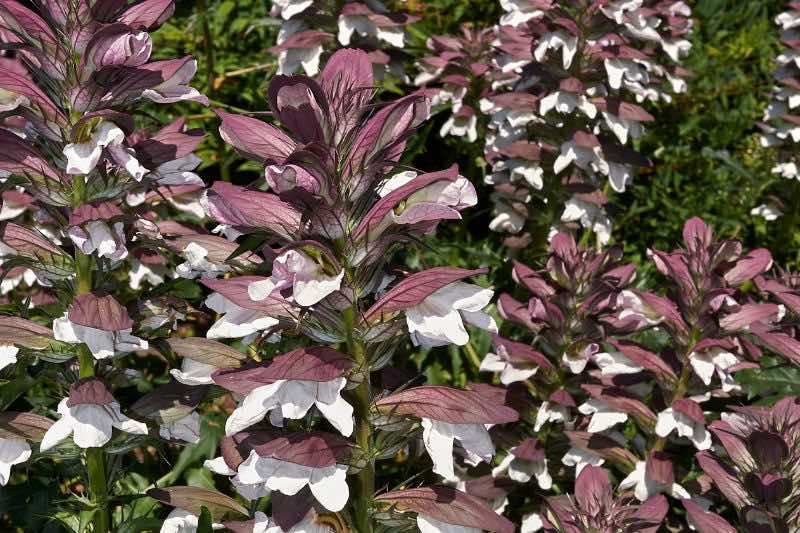 - l’acanthe à feuilles molles (Acanthus mollis), l’une des plus connues avec sa silhouette imposante et ses fleurs blanc-pourpre, dont la hampe peut atteindre jusqu’à 2 mètres de hauteur ;