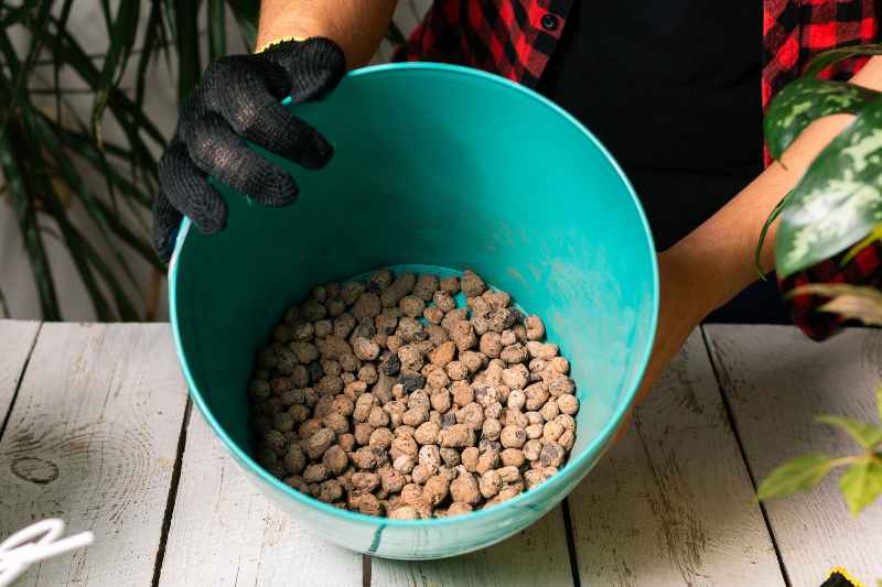 - Versez une couche de drainage de quelques centimètres au fond du nouveau pot (au moins 5 cm pour un pot de 50 cm de diamètre, de 7 à 10 cm pour un pot de 60 cm de diamètre, et plus s'il s'agit de plantes de type cactées). Cela dit, pour les très grands pots et plantes à feuillage large, on peut sauter cette étape, en considérant que cette couche de drainage prend un peu inutilement de la place alors que la plante a désormais surtout besoin de substrat pour continuer de la nourrir ;