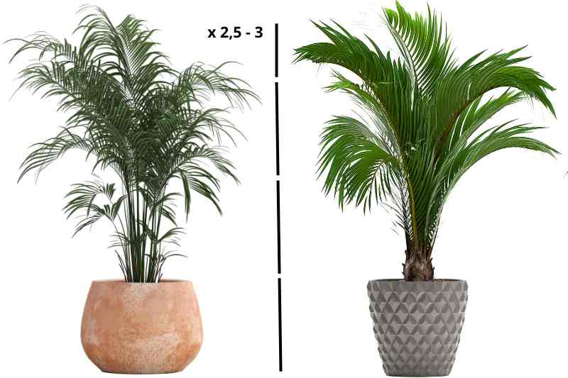 Concernant la taille du nouveau pot, il sera environ égal au quart de la hauteur de la plante, pour assurer une bonne stabilité. Choisissez le 5 cm environ plus large que le précédent, un peu plus pour les très gros palmiers.