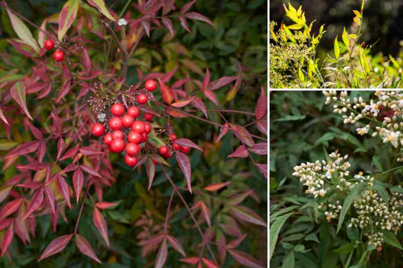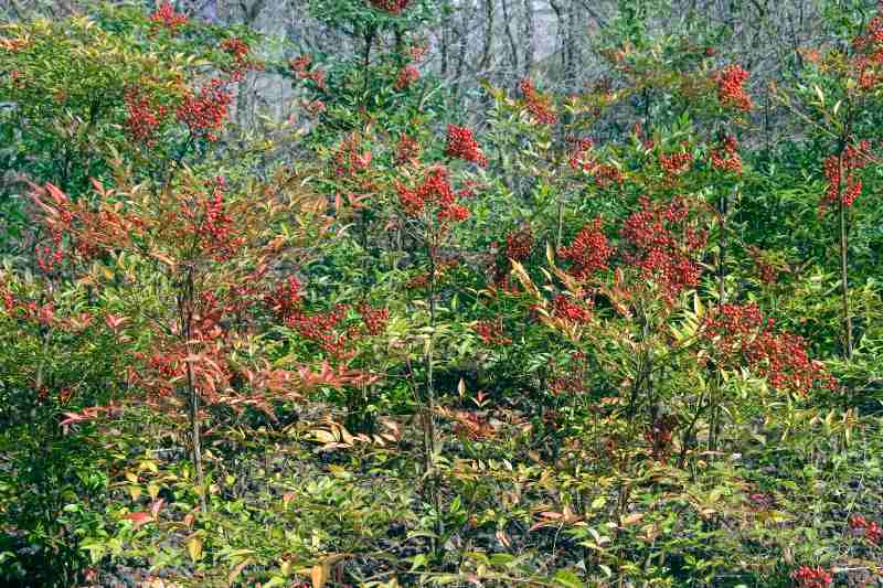 Le bambou sacré est apprécié pour ses couleurs changeantes du printemps à l'hiver et sa discrète floraison et généreuse fructification