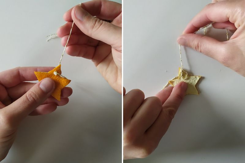 6- Faites ensuite un premier nœud à quelques centimètres de cette extrémité, puis passez la ficelle dans le trou de votre décoration. L'écorce d'orange doit ainsi buter sur ce nœud.