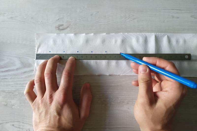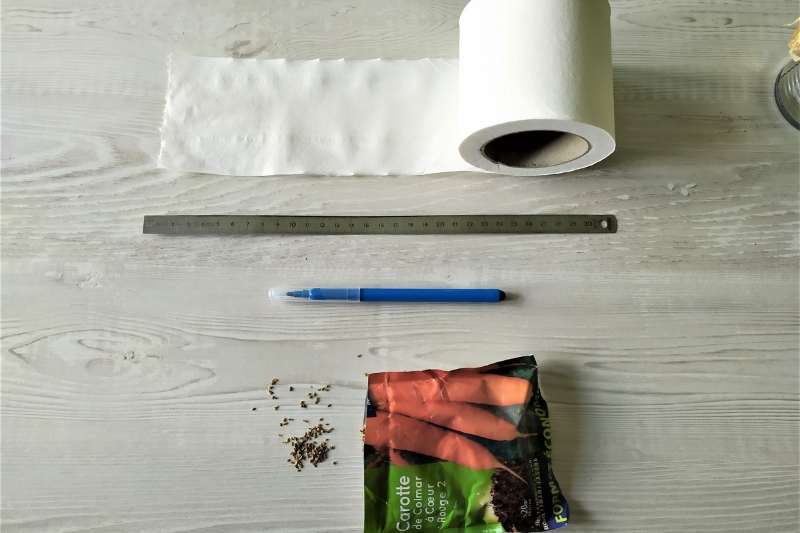 2- A l'aide d'une règle et d'un stylo, faites des repères pour marquer l'emplacement de chaque graine, au milieu du papier toilette. Dans l'exemple ici, un point a été fait tous les 3 cm pour des graines de carottes.