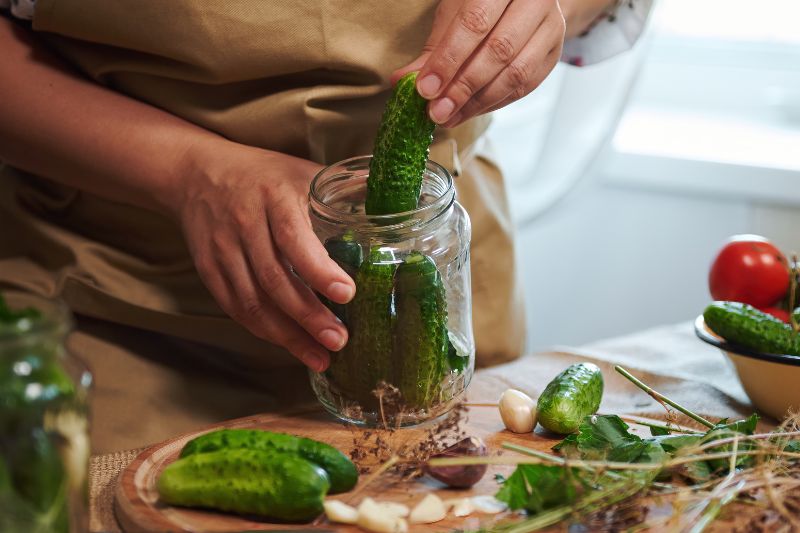 7- Remplissez les bocaux avec les cornichons en les tassant bien.