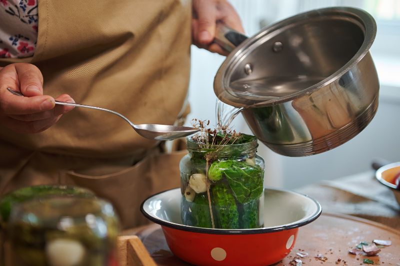 8- Versez la saumure refroidie dans les bocaux, en laissant environ 1 cm d'espace libre en haut. Assurez-vous que les cornichons sont entièrement recouverts de saumure.