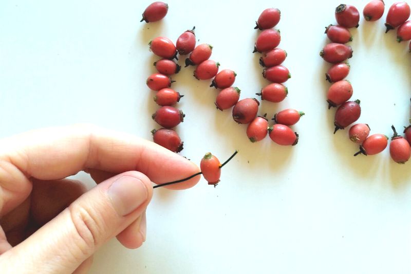 Lettre L : La lettre L est la plus simple. Comme pour la lettre N, enfilez les cynorrhodons sur un fil de fer coupé à la longueur souhaitée, en laissant un surplus pour la petite barre horizontale du bas.