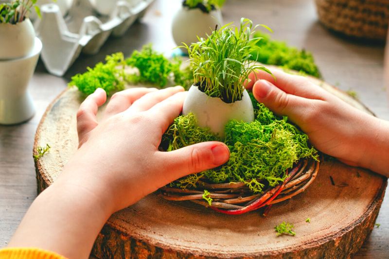 - Si votre enfant est très jeune ou que vous ne souhaitez pas faire une couronne, vous pouvez simplement apporter des petites touches de décorations autour des œufs. Par exemple, placez un peu de mousse verte, des fleurs séchées ou quelques plumes. Votre enfant peut aussi peindre ou décorer les coquilles. Et pourquoi pas simplement posé dans un coquetier ?