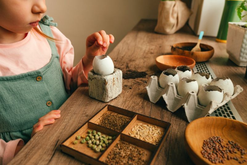 5- Planter ensuite entre 3 à 5 graines pour un joli rendu dans chaque coquille. C'est un bon exercice pour apprendre à compter ! Idéalement, changez la variété des graines d'une coquille à l'autre.