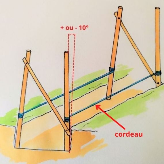 - Balisez l’emplacement de votre futur muret à l’aide de cordeaux. Noter que les parois de votre muret devront être incliné de 10% (approximativement 4°) pour une meilleure stabilité.