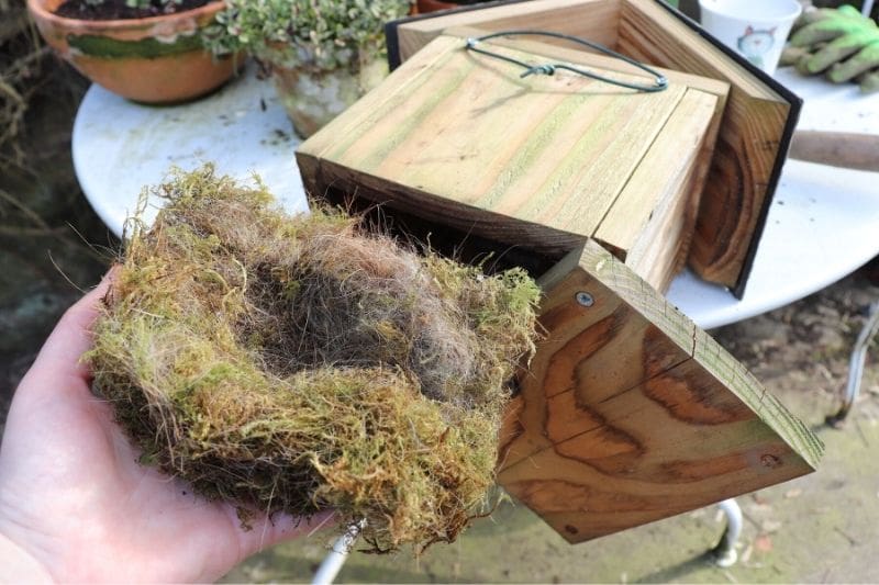 4- Vider le contenu du nichoir avec un bâton ou une petite pelle. Attention, ne mettez pas directement vos mains à l'intérieur ! En effet, d'autres occupants peuvent s'abriter dans ce nid d'oiseau douillet, comme un insecte piqueur, une chenille ou un petit serpent ;