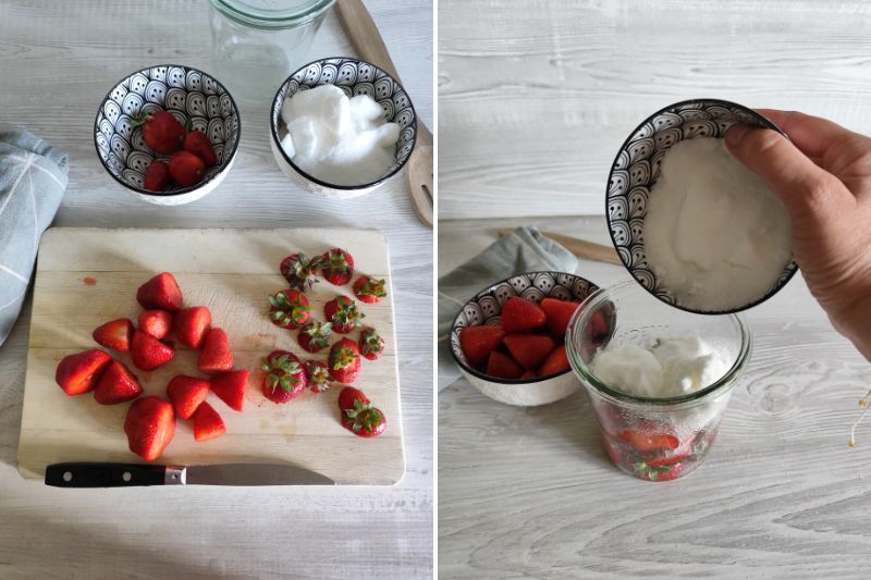 3- Alternez une couche de fruits (fraises coupées ou queues) et une couche de sucre jusqu'à remplir le bocal, en terminant par du sucre. Tassez légèrement. Le sucre va fondre progressivement et les fruits vont relâcher leur jus.