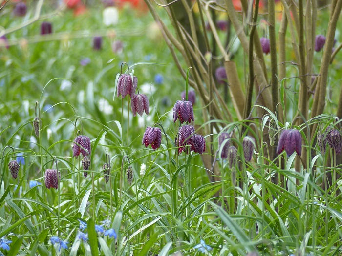 Après un coup d’œil à la célébrissime rivière de muscaris bleus que l'on retrouve sur toutes les cartes postales, Anne-Sophie m'a d'abord fait découvrir la partie la plus sauvage et naturelle du parc, dans une ambiance de sous-bois colorée par de nombreux petits bulbes naturalisés, comme les Anemone blanda, les Chionodoxa (Gloire-des-neiges), les fritillaires pintade ou meleagris, les Erythronium, l'ail des ours, et bien sûr les jonquilles et narcisses botaniques... mais aussi des variétés moins connues comme le Corydalis solida 'Beth Evans' accompagnés de quelques vivaces comme le myosotis du Caucase, sans oublier les irremplaçables anémones des bois blanches : celles-ci poussent en grands tapis de feuillage vert frais qui forme un écrin délicat pour les autres plantes.