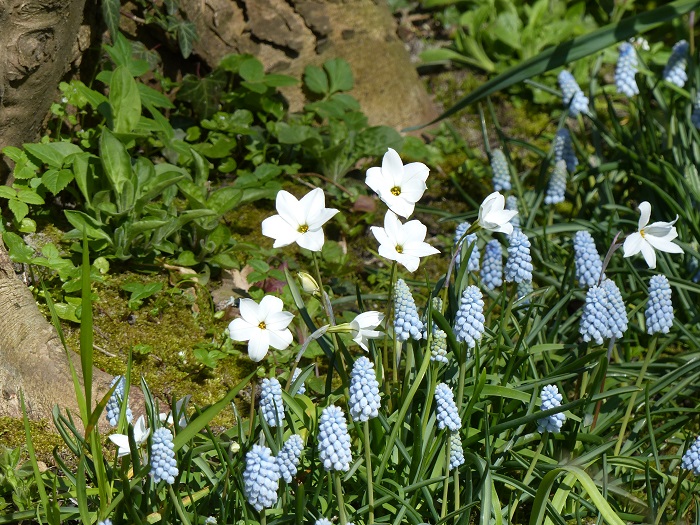 J'ai beaucoup apprécié cette scène pleine de charme au pied d'un vieux hêtre, associant deux petits bulbes d'exception : le Muscari 'Valérie Finnis' aux épis bleu porcelaine et l'Ipheion 'Alberto Castillo' aux fleurs étoilées blanches. Une idée facile à reproduire dans votre jardin !