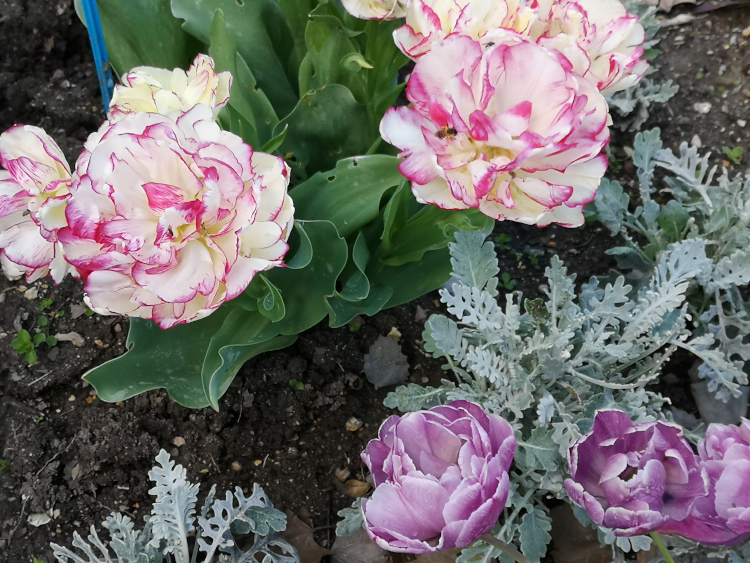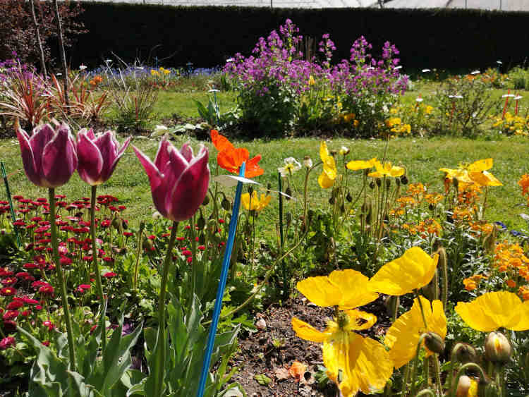 En poursuivant l'allée, on accède à l'espace consacré aux fleurs de saison, installé le long des serres. En ce début de mai, c'est l'endroit le plus fleuri du jardin. De longues plates-bandes de fleurs aux couleurs chatoyantes et délicates accrochent l'oeil. Au milieu du gazon vert tendre, tulipes, monnaies du pape, giroflées, pâquerettes, dianthus, pavots, pensées, euphorbes et saxifrages composent de magnifiques massifs aux couleurs gaies. On se régale devant la beauté des coloris et la majesté toute particulière des tulipes tardives roses, mauves, rouges et blanches, dont certaines , très riches en larges pétales, s'épanouissent à la manière des pivoines.