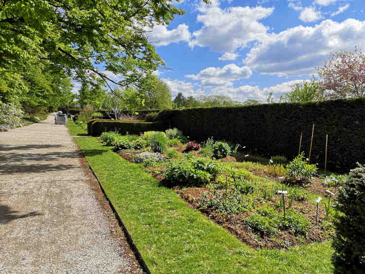 De passage ensuite par la roseraie, où les roses ne sont pas encore écloses, on peut faire une halte rafraichissante près du bassin bordé de hauts palmiers. La visite se poursuit par le parc paysager à l'anglaise et ses arbres remarquables, marronnier, cèdre du Liban, et autres résineux aux formes étonnantes, jalonnant de grandes pelouses verdoyantes. On croise des massifs de pivoines roses et de rhododendrons aux couleurs éclatantes cotoyant un érable japonais rouge et un cornus aux délicates fleurs rosées.