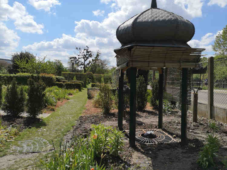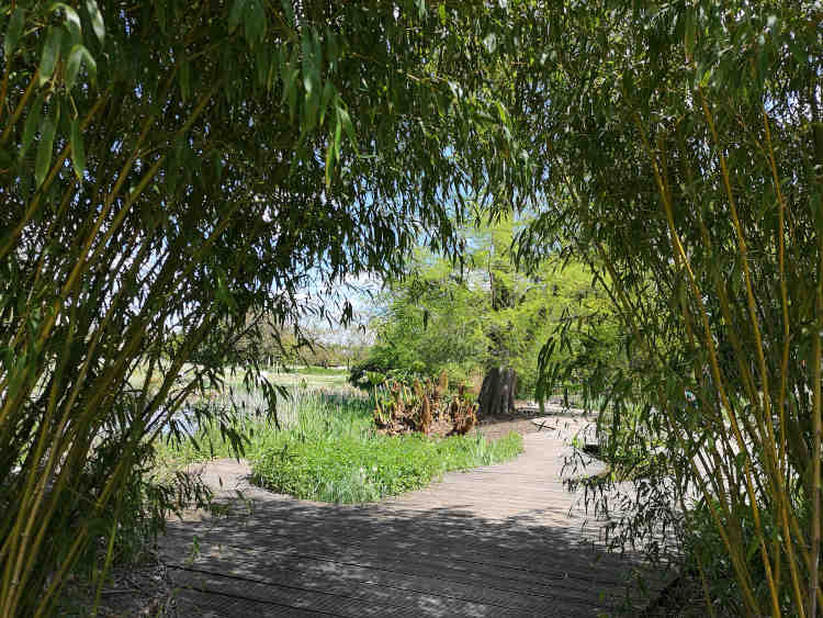 Un peu plus loin, l'eau revient sur le devant de la scène, avec un étang et des mares protégées par une mini-forêt de bambous et aménagées dans une allée de caillebotis, où trouvent refuge insectes et tétards.