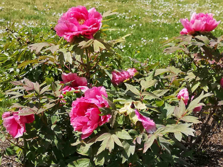 Parc à l'anglaise, pivoines et rhododendrons